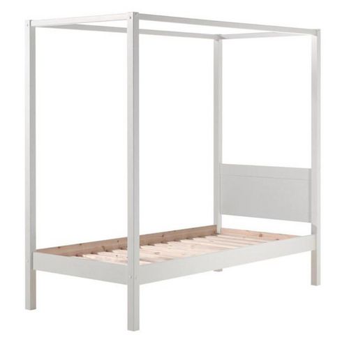 Informations Techniques : Dimensions : L. 208 x l. 97 x H. 190 cm Matière : Pin Massif Spécificités : Design & Confort Convient pour un matelas 90x200cm Lit à Baldaquin Sommier à lattes inclus Livré démonté avec notice de montage Poids : 22,5 kg Couleur : Blanc