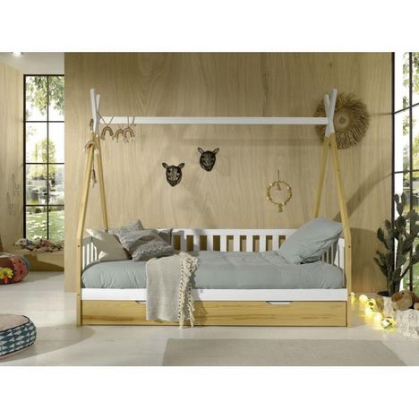 Informations Techniques : Dimensions : L. 206 x l. 188,5 x H. 96 cm Sommier 17 Lattes : L. 6 x l. 1,2 cm Tiroir : L. 198,5 x l. 94 x H. 19 cm Matière : Pin Massif Spécificités : Tendance & Pratique Lit Enfant Avec Barrière Design Tipi Tiroir de Lit inclus Sommier à Lattes inclus Poids Maximal Suppor