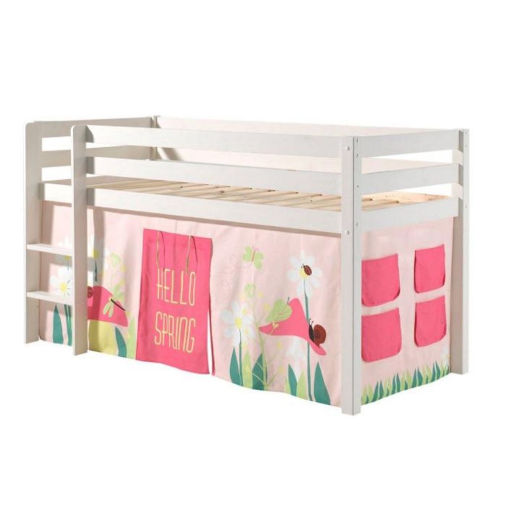 PINO Lit sureleve en pin massif avec sommier Blanc + Rideau de lit Spring