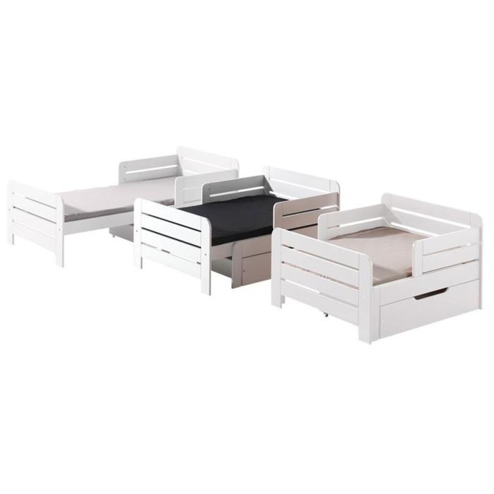 Informations Techniques : Dimensions : L. 147-167-207 x l. 102 x H. 72 cm Matière : Bois Spécificités : Convient à un matelas évolutif : 90x140-200 Non Inclus (voir nos produits) Sommier : Inclus Tiroir de lit : Non Inclus Poids supporté : Jusqu'à 80 kg À monter soi-même à l'aide de la notice de mon
