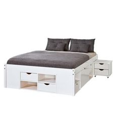 Informations Techniques : Dimensions : L. 209 x l. 186 x H. 47,5 cm Matière : Pin Massif Spécificités: Convient à un matelas de 180 x 200cm Équipé de : 2 grands tiroirs sur roulettes, 4 petits tirois, 8 niches ouvertes et 2 tables de chevets Tiroirs interchangeables, Aménagement modulable Possibili