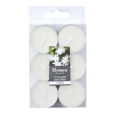 Informations Techniques : Dimensions : D. 3,5 cm Matière : Cire Spécificités : Design & Pratique Parfum de jasmin Lot de 12 bougies Poids : 0,18 kg Couleur : Blanc