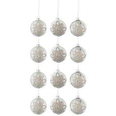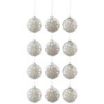 Informations Techniques : Dimensions : D. 8 x H. 8 cm Matières : Verre Spécificités : Tendance & Moderne Lot de 12 Boules de Noël Forme Ronde Design Ornement avec Perles Couleur Blanc Mat Couleur Argent Brillant Poids : 0,026 kg Couleur : Argent, Blanc