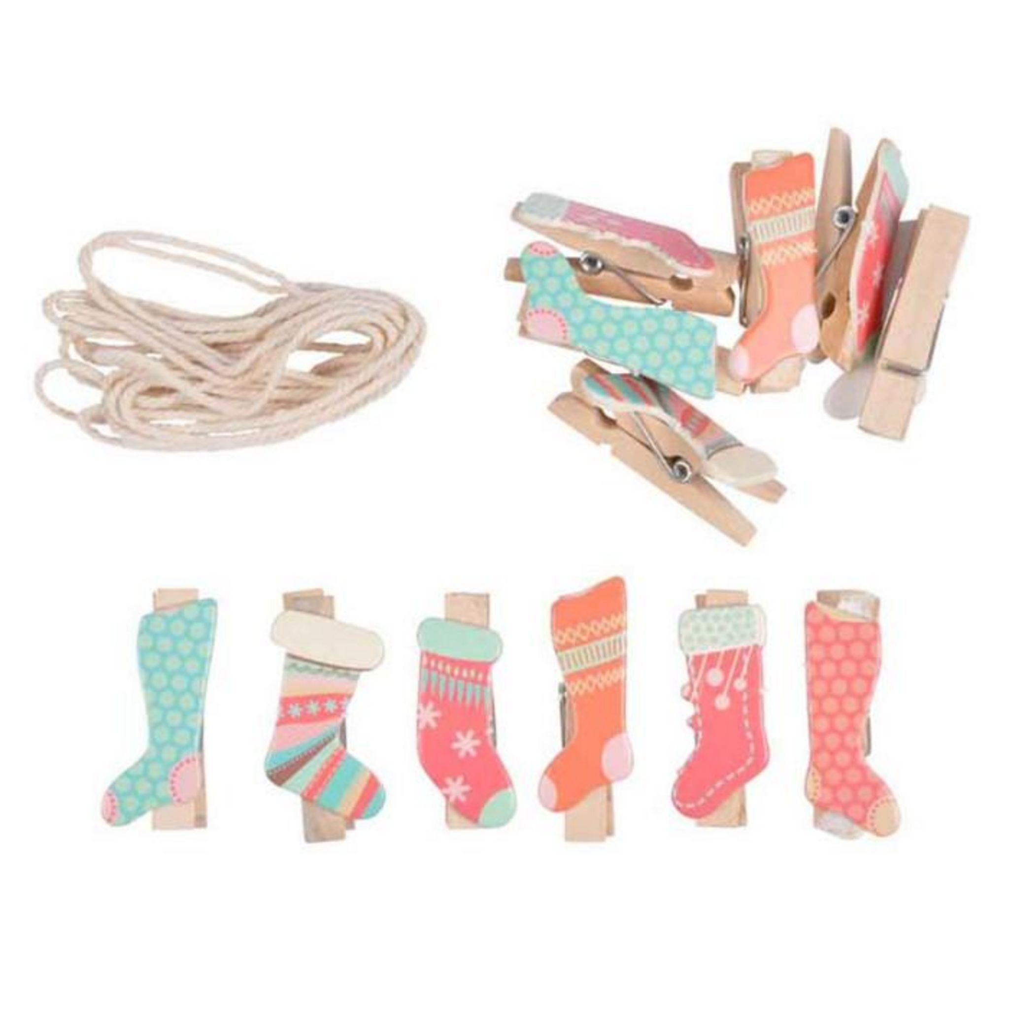 Informations Techniques : Matière : Bois Spécificités : Pratique & Tendance Lot de 12 Pinces Thème de Noël Pour Calendrier de l'Avent Avec Fils d'Attaches Design Chaussettes de Noël Couleur : Multicolore