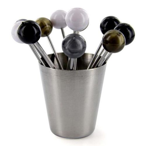 Informations Techniques : Dimensions : D. 3,6 x H. 4,1 cm Matières : Métal & Acier inoxydable Spécificités : Pratique & Utile Lot de 12 piques à Bigorneaux Avec Support Couleur : Argent, Blanc, Gris & Or