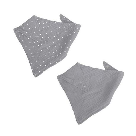 Informations Techniques : Dimensions : L. 41 x l. 16 cm Matière : 100% Gaze de Coton Spécificités : Pratique & Ajustable Lot de 2 Bavoirs Forme Bandana Motif Imprimé Poids : 0,028 kg Couleur : Gris