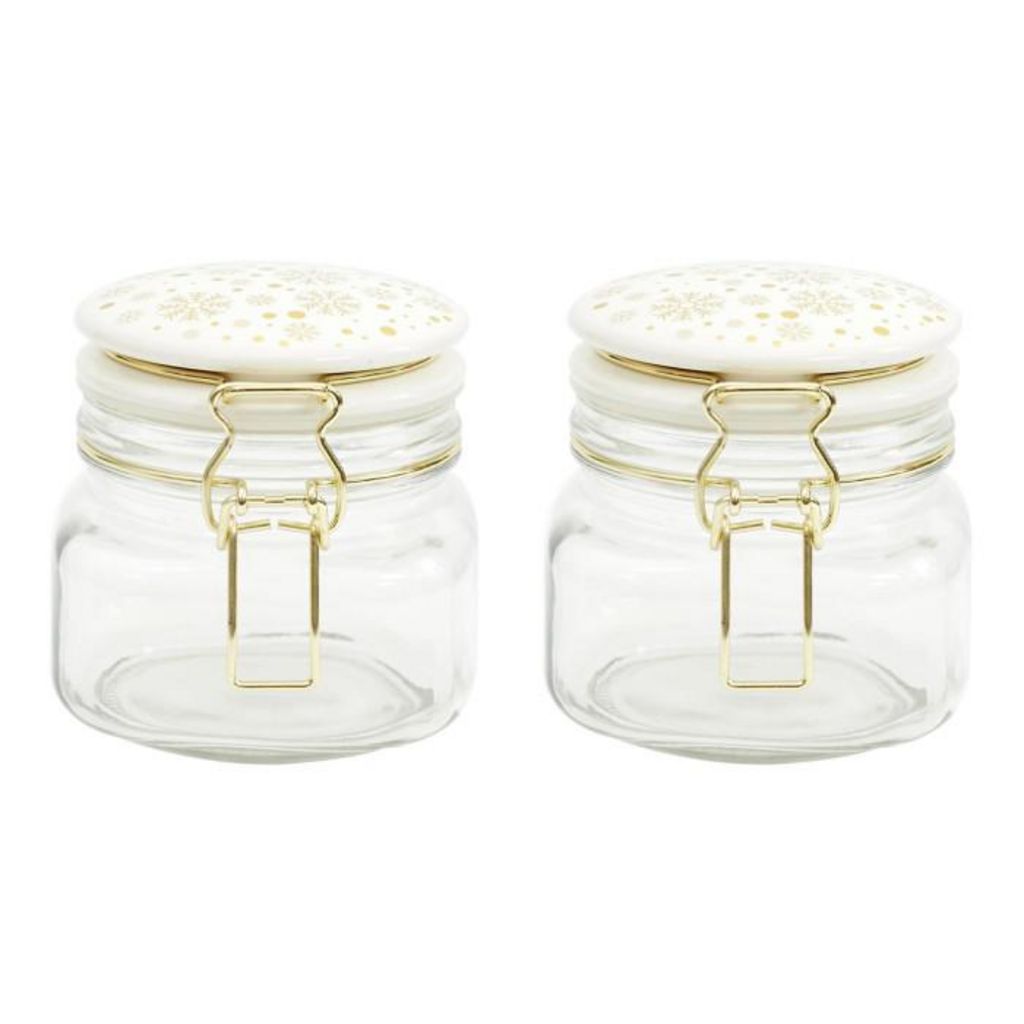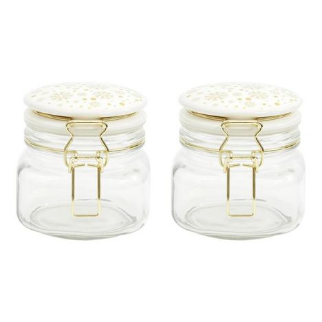 Informations Techniques : Dimensions : L. 13,2 x l. 10,8 x H. 11,3 cm Matière : Verre, Grès, Acier Inoxydable & Silicone Spécificités : Pratique & Utile Lot de 2 bocaux en verre Couvercle en céramique Avec imprimé flocon Poids : 0,52 kg Couleur : Transparent, Blanc & Doré