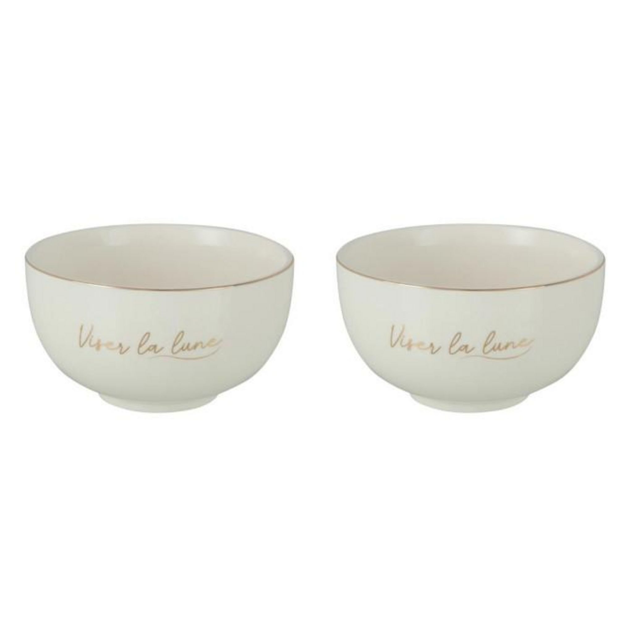 Informations Techniques : Dimensions : D. 14 x H. 7,8 cm Matière : 100% Porcelaine Spécificités : Utile & Élégant Lot de 2 bols Inscription viser la lune Forme ronde Poids : 0,41 kg Couleur : Blanc & Or