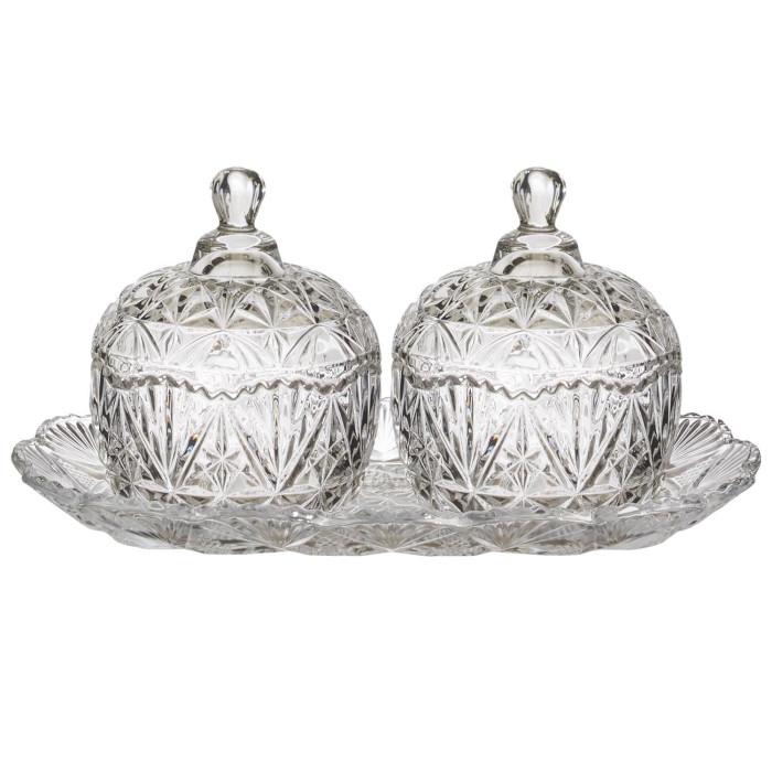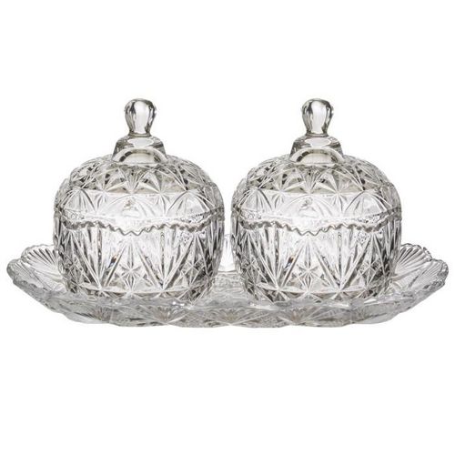 Informations Techniques : Dimensions : L. 26 x l. 16,5 x H. 14 cm Matière : 100% Verre Spécificités : Pratique & Élégante Lot de 2 bonbonnières design Avec plateau Poids : 1,34 kg Couleur : Transparent