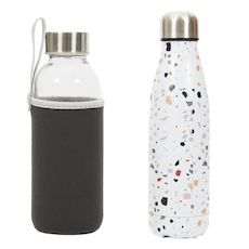 Informations Techniques : Dimensions : L. 27 x l. 24 x H. 18 cm Matières : Métal & Acier inoxydable Spécificités : Pratique & Utile Lot de 2 Bouteilles Isothermes Forme Ronde Avec Pochon Contenance : 50 cl Poids : 0,41 kg Couleur : Blanc & Taupe