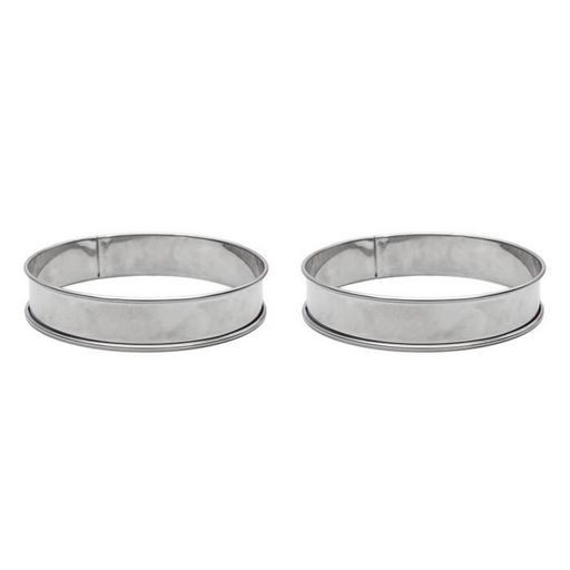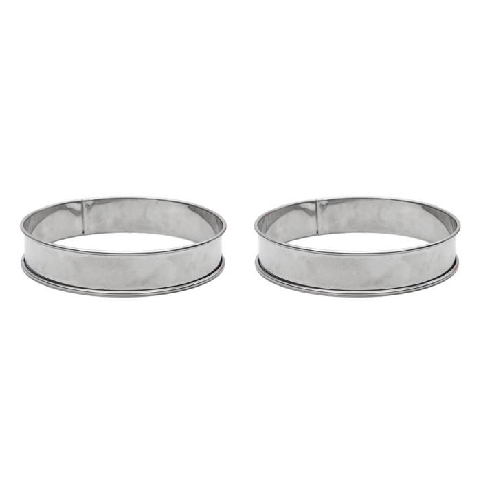 Informations Techniques : Dimensions : L. 12 x l. 2,5 x H. 2,1 cm Diamètre : D. 12 cm Matière : 100% Acier Inoxydable Spécificités : Pratique & Utile Lot de 2 cercles à tartelettes Forme ronde Poids : 0,02 kg Couleur : Argent