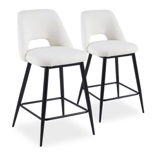 Informations Techniques : Dimensions : L. 44 x l. 54 x H. 92,5 cm Hauteur d'assise : H. 66 cm Matières : Métal & Tissu Spécificités : Confortable & Tendance Lot de 2 chaises de bar Tissu bouclette Dossier arrondi Poids : 13 kg Couleur : Crème & Noir