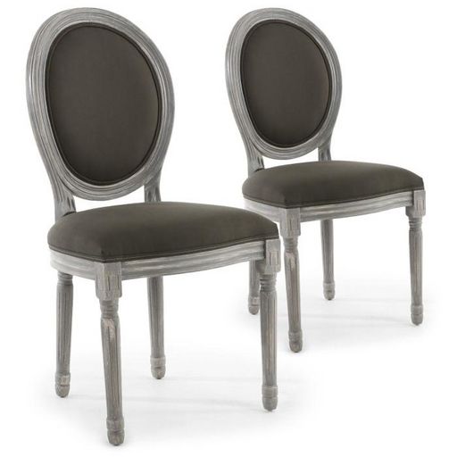 Informations Techniques : Dimensions : L. 49 x l. 46 x H. 96 cm Matière : Tissu & Bois Spécificités : Design altique chic Assise & dossier rembourrés Livré par lot de 2 chaises Couleur : Gris & Bois Patiné Gris Assise : Gris Structure : Bois Patiné Gris