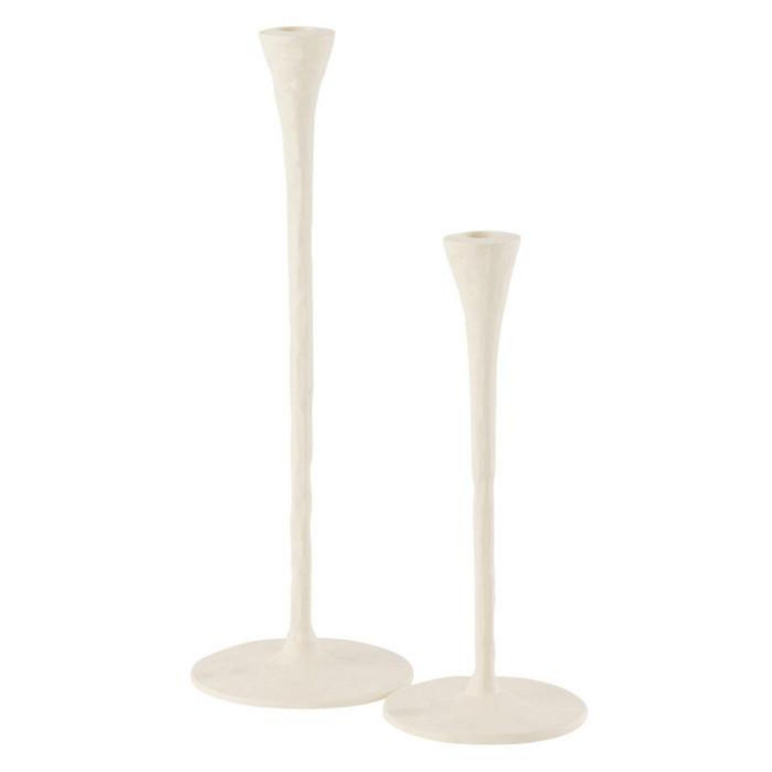 Informations Techniques : Dimensions : Taille 1 : D. 13 x H. 30 cm Taille 2 : D. 14 x H. 42 cm Matière : 100% Aluminium Spécificités : Déco & Utile Lot de 2 chandeliers Bougies non incluses Poids : 0,91 kg Couleur : Blanc
