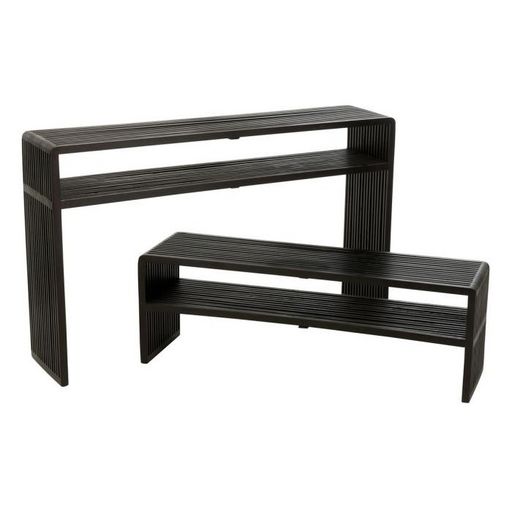 Informations Techniques : Dimensions : Taille 1 : L. 118 x l. 30 x H. 40 cm Taille 2 : L. 130 x l. 30 x H. 80 cm Matière : 100% Bois (Recyclé) Spécificités : Élégant & Naturel Lot de 2 consoles Avec étagère Poids max supporté : 100 kg Poids : 20 kg Couleur : Noir