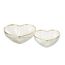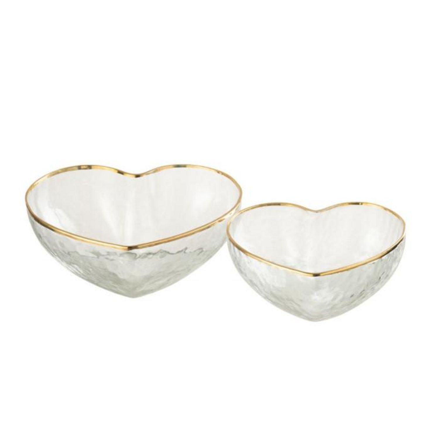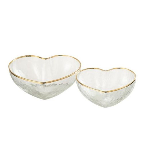 Informations Techniques : Dimensions : Taille 1 : L. 12 x l. 12 x H. 5 cm Taille 2 : L. 15 x l. 15 x H. 5,5 cm Matière : Verre Spécificités : Pratique & Romantique Lot de 2 coupelles apéro Avec bordure dorée Design coeur Poids : 0,31 kg Couleur : Transparent