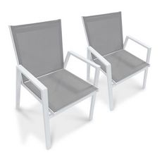 Informations Techniques : Dimensions : L. 60 x l. 56 x H. 86 cm Assise : H. 45/42,5 cm Accoudoirs : H. 61 cm Matières : Aluminium & Textilène Spécificités : Confortable & Tendance Lot de 2 fauteuils d'extérieur empilables Nombre de colis : 1 Poids max supporté : 120 kg Poids : 7 kg Couleur : Blanc
