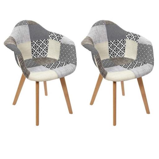 Informations Techniques : Dimensions : L. 59 x l. 63,8 x H. 85 cm Hauteur d'Assise : 47,8 cm Matière : Bois (Hêtre) Spécificités : Pratique & Utile Lot de 2 Fauteuils design Assise Confortable Look Rétro Motif Patchwork Poids : 5,75 kg Couleur : Gris