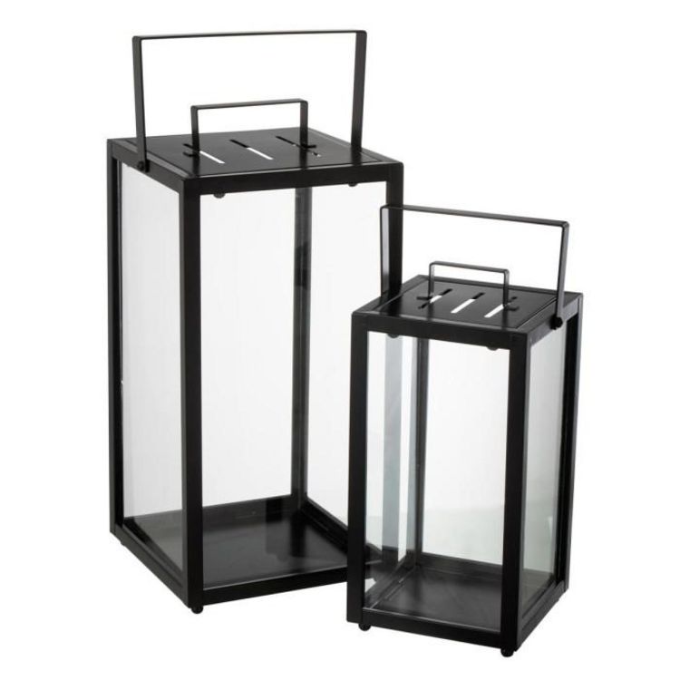 Informations Techniques : Dimensions : Taille 1 : L. 16 x l. 16 x H. 33 cm Taille 2 : L. 21 x l. 21 x H. 43 cm Matières : 50% Verre & 50% Métal Spécificités : Moderne & Pratique Lot de 2 lanternes Avec anses Ouverture par le haut Bougies non incluses Poids : 3,7 kg Couleur : Noir