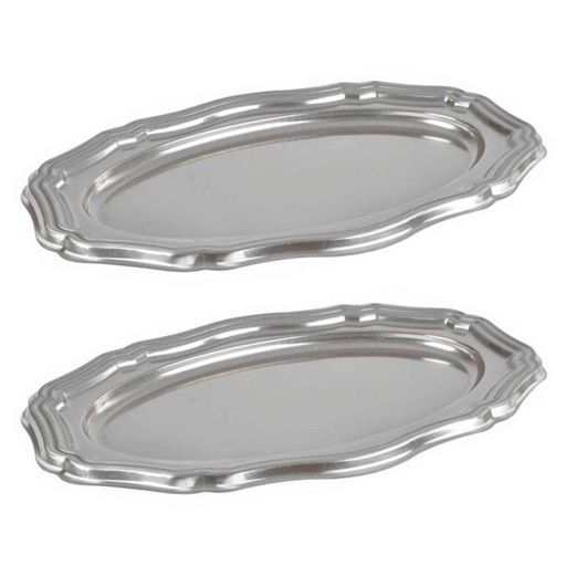 Informations Techniques : Dimensions : L. 40 x l. 26 cm Matière : PET (polytéréphtalate d'éthylène) Spécificités : Pratique & Utile Lot de 2 Plateaux Déco Entretien facile Pratique d'utilisation Style Louis XV Jetable Couleur : Argent