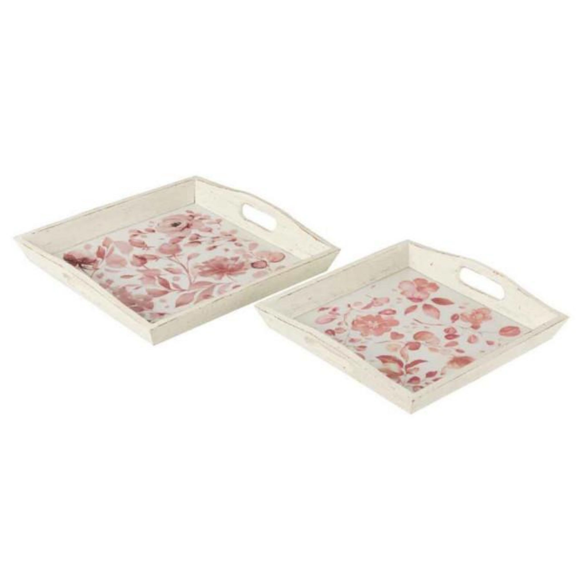 Informations Techniques : Dimensions : Taille 1 : L. 41 x l. 39,5 x H. 6,5 cm Taille 2 : L. 35,5 x l. 34,5 x H. 6 cm Matière : Bois Spécificités : Tendance & Moderne Lot de 2 Plateaux de Service Forme Rectangulaire Motif Fleurs Couleur : Rose & Blanc