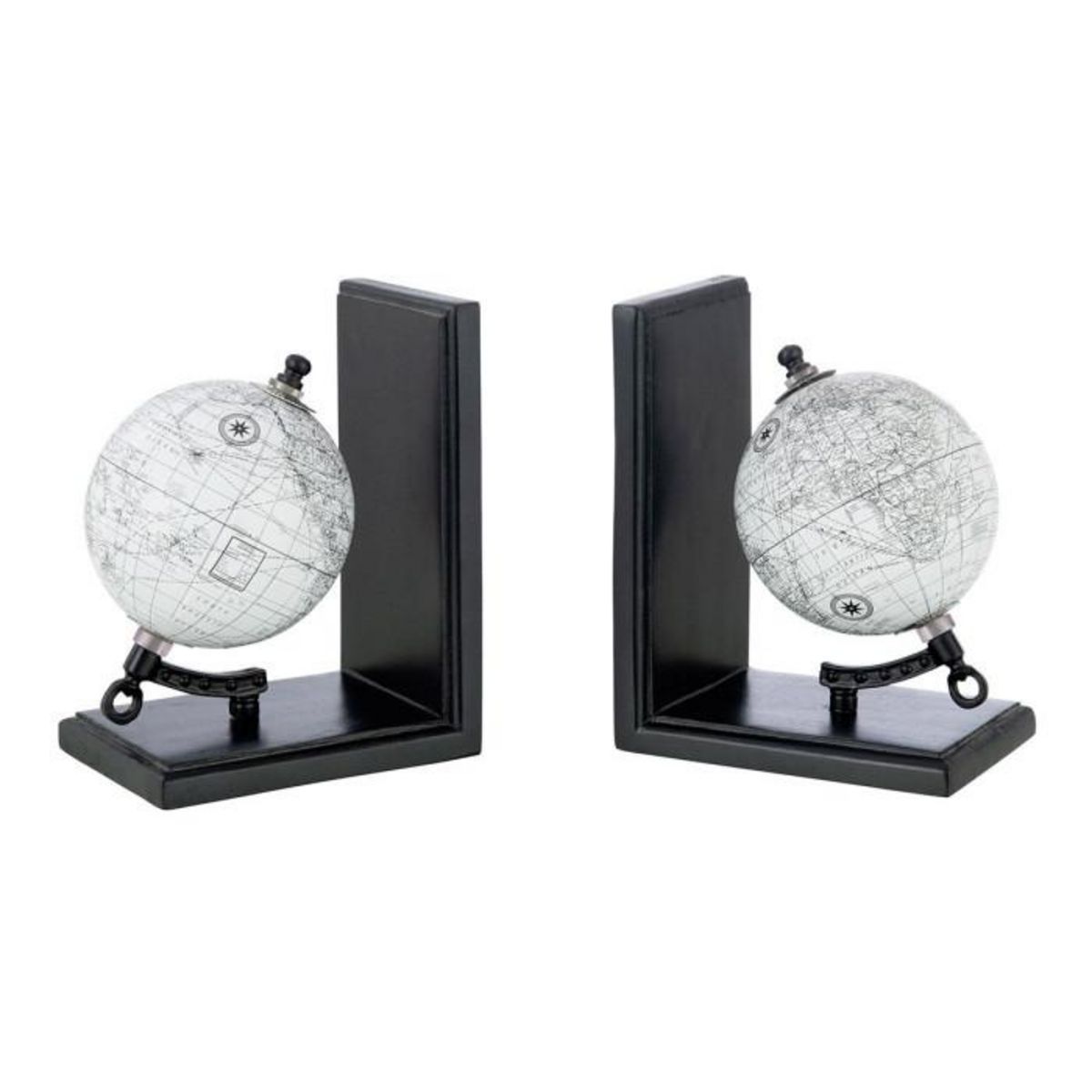Informations Techniques : Dimensions : L. 28,5 x l. 10 x H. 18 cm Matières : Bois (Manguier) & Platique Spécificités : Utile & Déco Lot de 2 serre-livres Design globe Poids : 0,8 kg Couleur : Noir & Gris