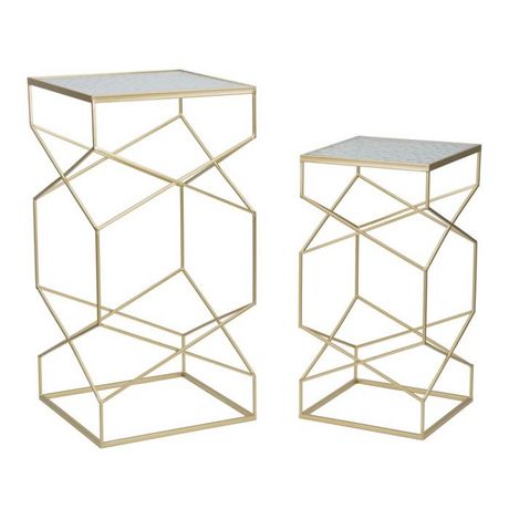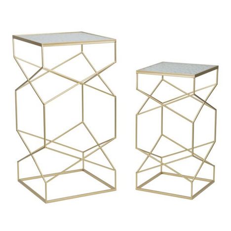 Informations Techniques : Dimensions : Petite : L. 40 x l. 40 x H. 80 cm Grande : L. 50 x l. 50 x H. 100 cm Matières : Plateau : Verre Piètement : Métal Spécificités : Pratique & Utile Lot de 2 tables d'appoint design Plateau en verre travaillé Piètement design géométrique Poids : 9,8 kg Couleur :