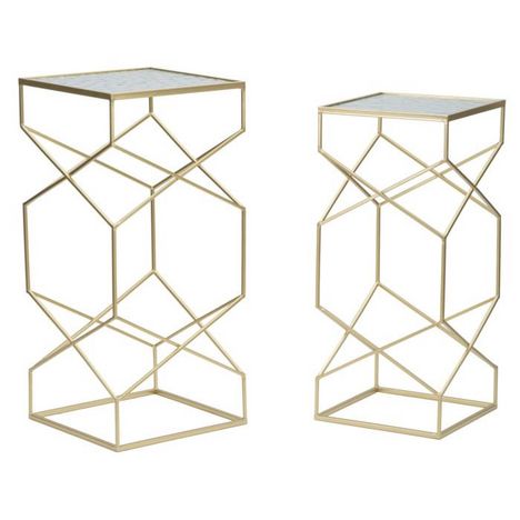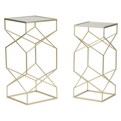 Informations Techniques : Dimensions : Petite : L. 25 x l. 25 x H. 64 cm Grande : L. 31,5 x l. 31,5 x H. 68 cm Matières : Plateau : Verre Piètement : Métal Spécificités : Pratique & Utile Lot de 2 tables d'appoint design Plateau en verre travaillé Piètement design géométrique Poids : 4,5 kg Couleu