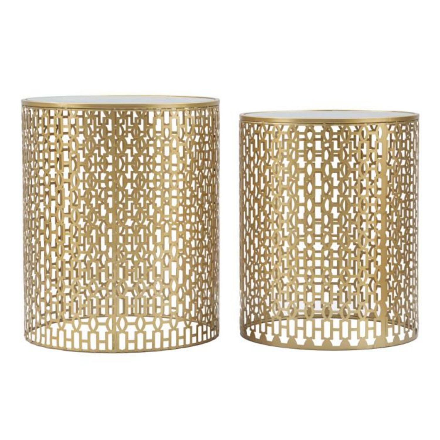 Informations Techniques : Dimensions : Petite : L. 37,5 x l. 37,5 x H. 47 cm Grande : L. 41 x l. 41 x H. 50 cm Matières : Métal, Verre & MDF Spécificités : Pratique & Déco Lot de 2 tables d'appoint rondes Plateau en miroir Design ajouré Poids : 6,5 kg Couleur : Or
