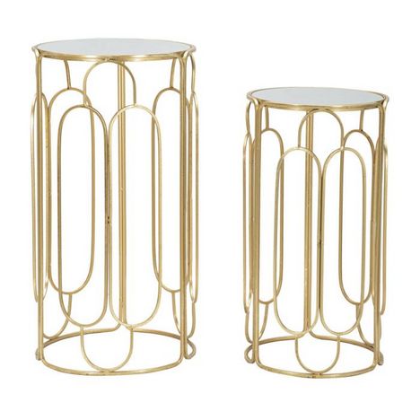 Informations Techniques : Dimensions : Petite : L. 31 x l. 31 x H. 60 cm Grande : L. 36,5 x l. 36,5 x H. 70 cm Matières : Plateau : Verre Piètement : Métal Spécificités : Pratique & Tendance Lot de 2 tables d'appoint Plateau en miroir Forme ronde Poids : 8 kg Couleur : Or