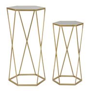 Informations Techniques : Dimensions : Petite : L. 40 x l. 40 x H. 80 cm Grande : L. 50 x l. 50 x H. 100 cm Matières : Métal, MDF & Verre Spécificités : Pratique & Utile Lot de 2 tables d'appoint design Forme hexagonale Plateaux en verre miroir Poids : 7,15 kg Couleur : Or