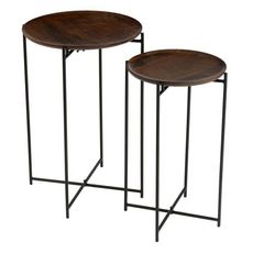 Informations Techniques : Dimensions : Taille 1 : L. 31,5 x l. 32,5 x H. 50 cm Taille 2 : L. 39 x l. 39 x H. 56 cm Matières : 72% Métal & 28% Bois (Manguier) Spécificités : Pratique & Utile Lot de 2 tables d'appoint Forme ronde À monter soi-même Poids : 6,26 kg Couleur : Marron & Noir