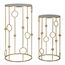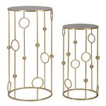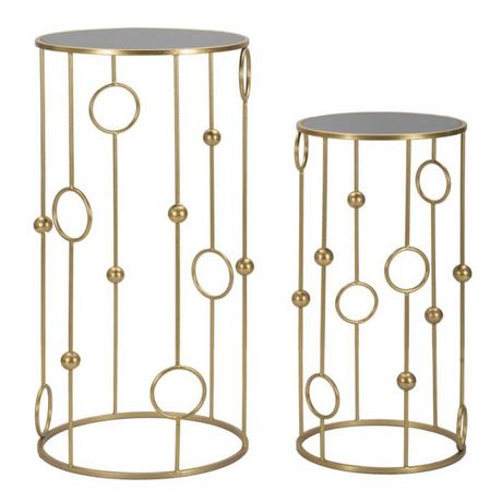 Informations Techniques : Dimensions : Petite : L. 40 x l. 40 x H. 80 cm Grande : L. 50 x l. 50 x H. 100 cm Matières : Métal, MDF & Verre Spécificités : Pratique & Utile Lot de 2 tables d'appoint rondes Plateau en verre miroir Piètement design cercle et sphère Poids : 8,25 kg Couleur : Or