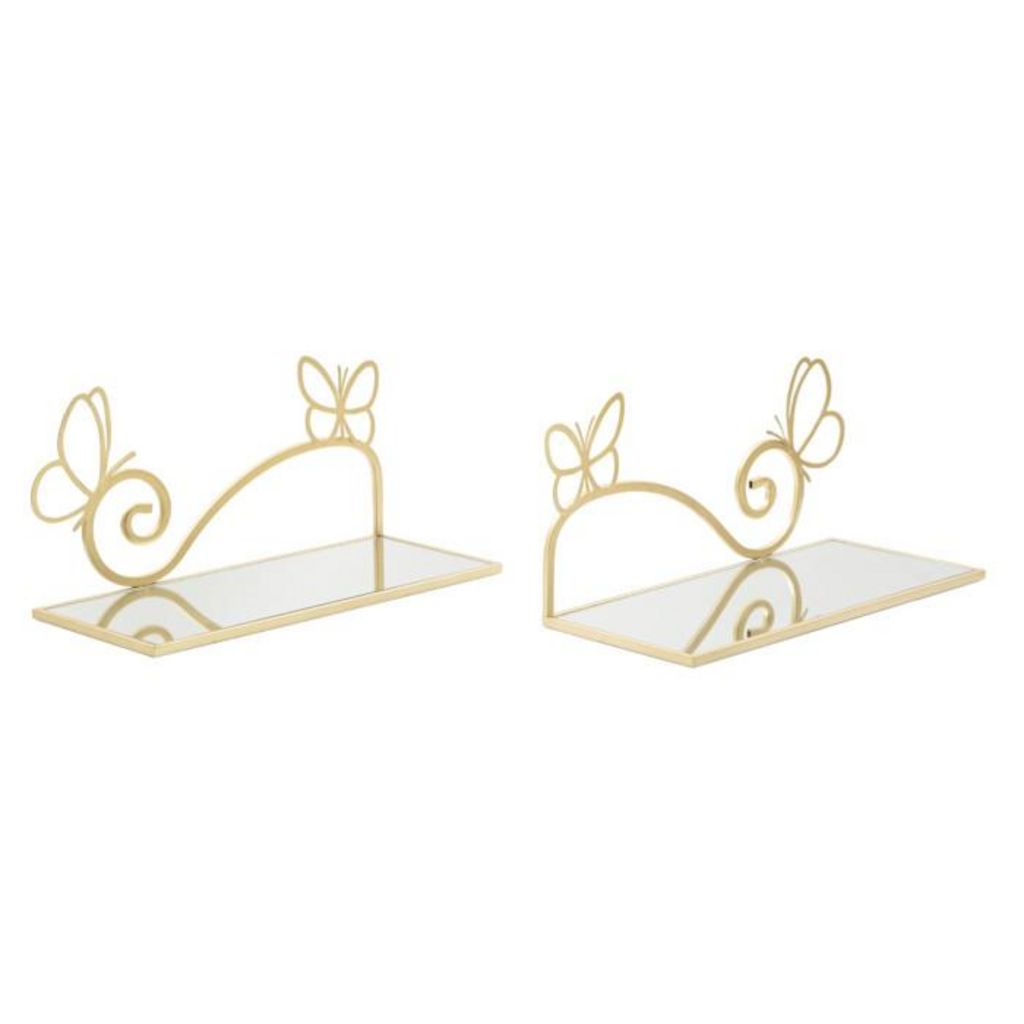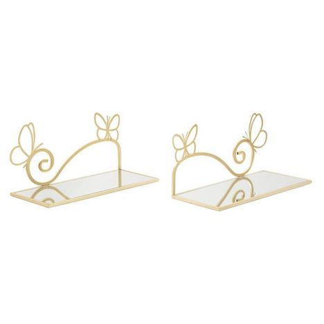 Informations Techniques : Dimensions : L. 41,5 x l. 18 x H. 21 cm Miroir : L. 40 x l. 16,5 cm Matières : Métal, MDF & Verre Spécificités : Pratique & Déco Lot de 2 tables de nuit murales Plateau en verre miroir Ornement papillons Poids : 2,4 kg Couleur : Or