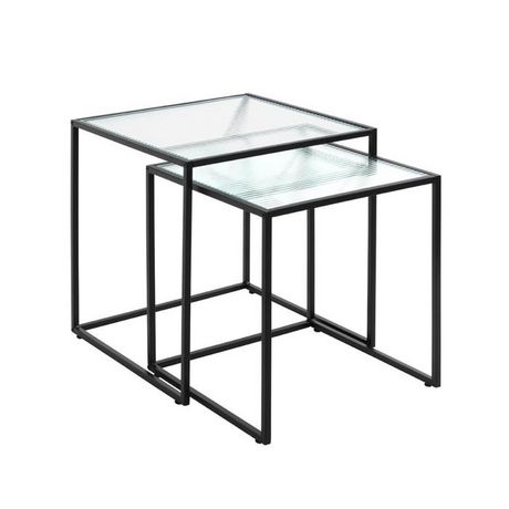 Informations Techniques : Dimensions : Taille 1 : L. 45 x l. 45 x H. 49 cm Taille 2 : L. 40 x l. 40 x H. 44 cm Matières : Structure : Acier Plateau : Verre trempé Spécificités : Pratique & Utile Lot de 2 tables gigognes Verre trempé décoratif vague Peinture finition laquée Forme carrée Poids :