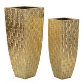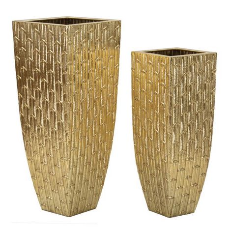 Informations Techniques : Dimensions : Taille 1 : L. 32 x l. 32 x H. 84 cm Taille 2 : L. 40 x l. 40 x H. 99 cm Matière : Métal Spécificités : Élégant & Intemporel Lot de 2 vases design Motifs linéaires en relief Poids : 9,37 kg Couleur : Or