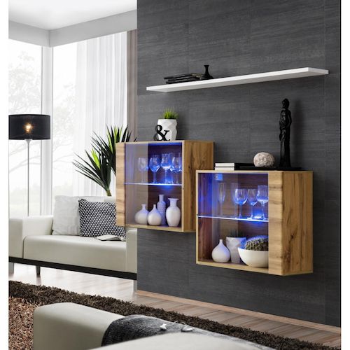 Lot de 2 Vitrines Murales & Étagère Switch SBIII 130cm Naturel & Blanc