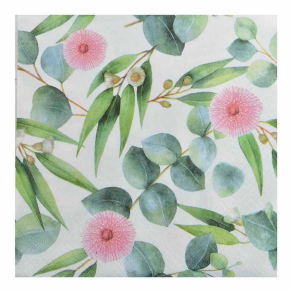Informations Techniques : Dimensions : L. 33 x l. 33 cm Matière : Papier Spécificités : Pratique & Utile Lot de 20 Serviettes Forme Carrée 3 Plis Design Fleur d'Eucalyptus Poids : 0,1 kg Couleur : Vert