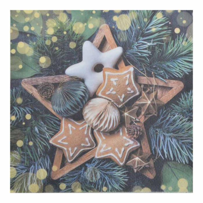 Informations Techniques : Dimensions : L. 33 x l. 33 cm Matières : Papier Spécificités : Pratique & Utile Lot de 20 Serviettes Forme Carrée 3 Plis Design Gâteaux & Étoile Poids : 0,112 kg Couleur : Naturel & Vert