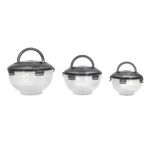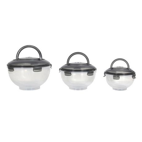 Informations Techniques : Dimensions : D. 24 x H. 16,5 cm Matière : 100% Polypropylène Spécificités : Pratique & Utile Lot de 3 boîtes à emporter Compatibilités : Lave-vaisselle et micro-ondes Capacité : 5,8 L Poids : 0,56 kg Couleur : Transparent