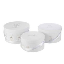Informations Techniques : Dimensions : Taille 1 : D. 32 x H. 18 cm Taille 2 : D. 29 x H. 16 cm Taille 3 : D. 26 x H. 14 cm Matière : Carton Spécificités : Pratique & Tendance Lot de 3 Boîtes de Rangement Pour Enfant Forme Ronde Motif Ourson Poids : 1,15 kg Couleur : Blanc