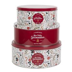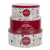 Informations Techniques : Dimensions : Taille 1 : D. 19 cm x H. 8 cm Taille 2 : D. 22 cm x H. 9 cm Taille 3 : D. 25 cm x H. 10 cm Matière : Métal Spécificités : Pratique & Déco Lot de 3 boîtes Inscription Mes petites gourmandises Motif végétal Forme ronde Poids : 0,78 kg Couleur : Rouge