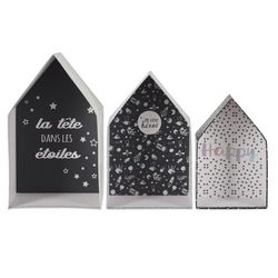 Informations Techniques : Dimensions : Taille 1 : L. 23 x l. 15 x H. 8 cm Taille 2 : L. 28 x l. 18 x H. 10 cm Taille 3 : L. 32 x l. 20 x H. 12 cm Matières : Papier & Carton Spécificités : Pratique & Utile Lot de 3 Boîtes Gigognes Forme Maison A Motifs Facile d'entretien & d'utilisation Couleur : Gr