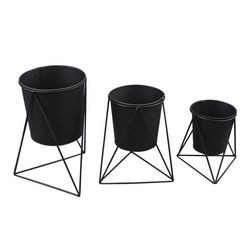 Informations Techniques : Dimensions : Pot 1 : D. 10 x H. 15 cm Pot 2 : D. 12 x H. 20 cm Pot 3 : D. 14 x H. 25 cm Matière : Métal Spécificités : Design & Tendance Pieds en formes géométriques Vendu en lot de 3 Poids : 1,03 kg Couleur : Noir