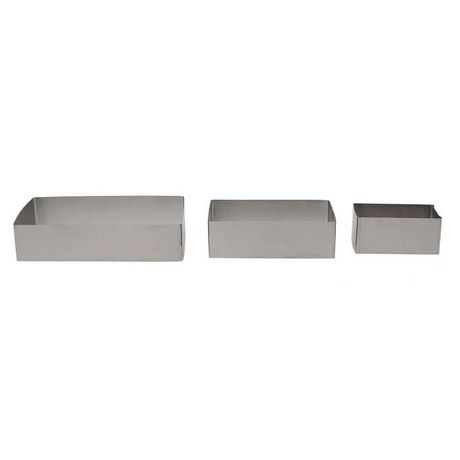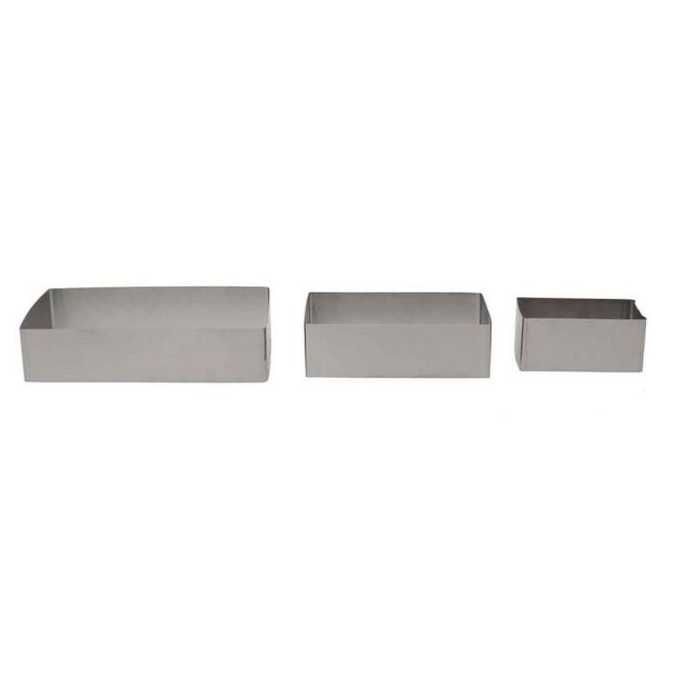 Informations Techniques : Dimensions : Taille 1 : L. 10 x l. 4,5 x H. 4,5 cm Taille 2 : L. 15 x l. 4,5 x H. 4,5 cm Taille 3 : L. 20 x l. 4,5 x H. 4,5 cm Matières : Métal & Acier inoxydable Spécificités : Pratique & Utile Lot de 3 Cadres à Pâtisserie Forme Rectangulaire Idéal pour le Montage de Gâte