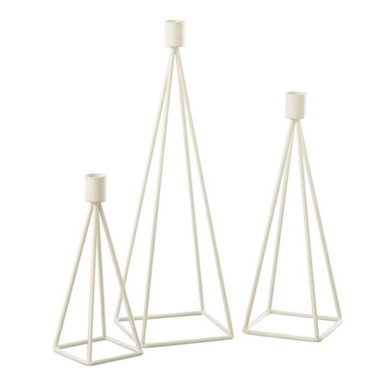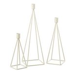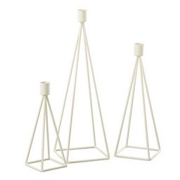 Informations Techniques : Dimensions : L. 12 x l. 12 x H. 38,5 cm Matière : Métal Spécificités : Tendance & Pratique Lot de 3 Chandeliers Design Forme Triangulaire Bougies non incluses Poids : 0,71 kg Couleur : Blanc