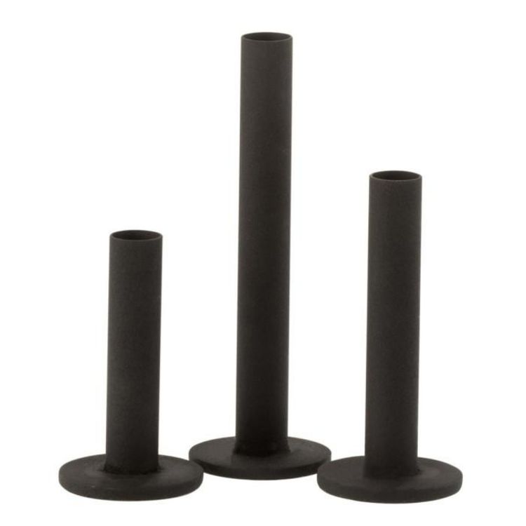 Informations Techniques : Dimensions : Taille 1 : D. 7 x H. 21,5 cm Taille 2 : D. 7 x H. 15,5 cm Taille 3 : D. 7 x H. 12 cm Matière : Métal Spécificités : Pratique & Utile Lot de 3 Chandeliers Design Moderne Effet Mat Poids : 0,96 kg Couleur : Noir Mat