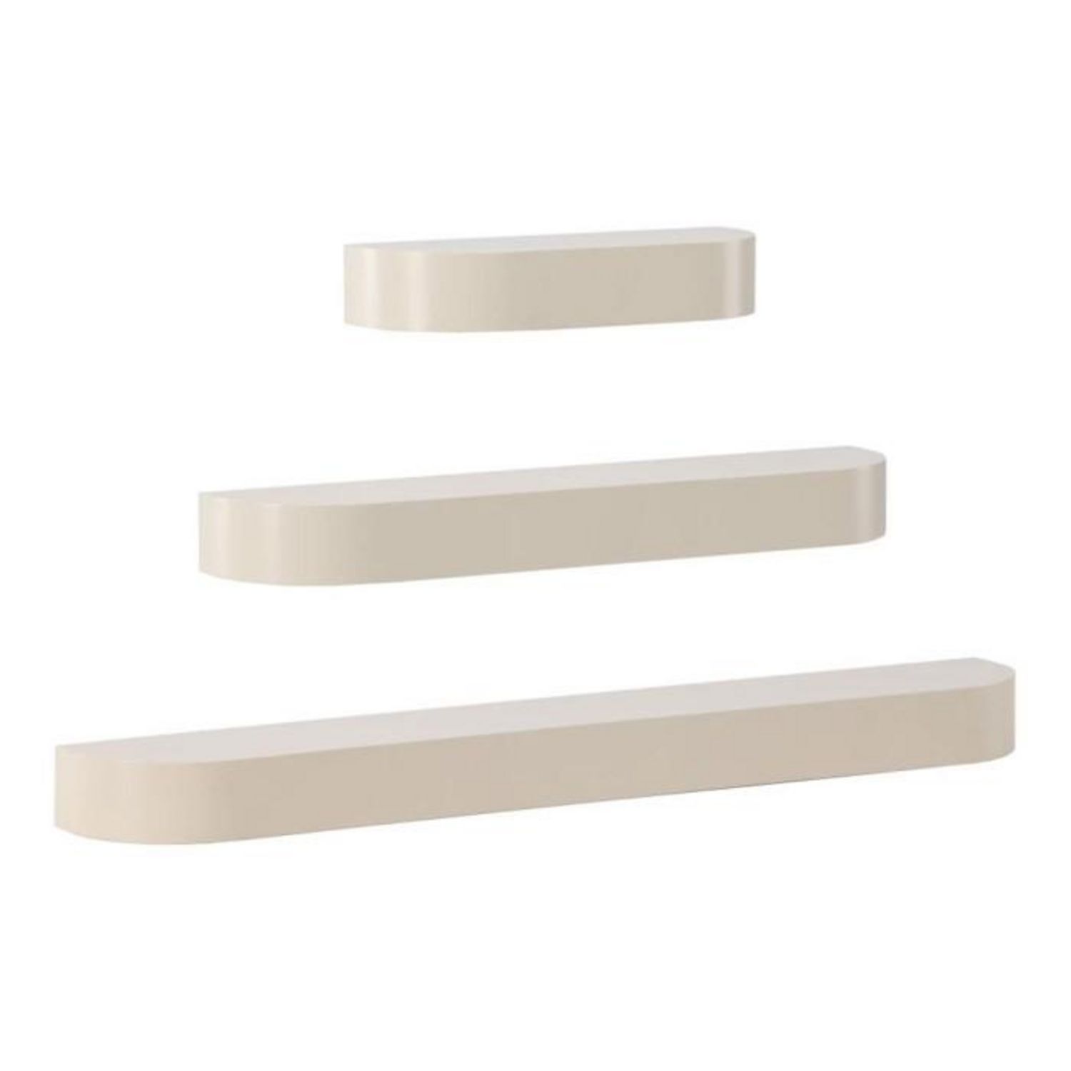 Informations Techniques : Dimensions : Petite : L. 55 x l. 20 x H. 10 cm Moyenne : L. 95 x l. 20 x H. 10 cm Grande : L. 135 x l. 20 x H. 10 cm Matière : MDF Spécificités : Pratique & Élégant Lot de 3 étagères Bords arrondis Accroches invisibles Idéal pour livres et objets déco Poids max supporté :