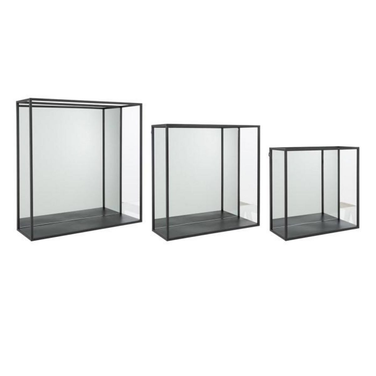 Informations Techniques : Dimensions : Taille 1 : L. 60 x l. 18 x H. 60 cm Taille 2 : L. 50 x l. 18 x H. 50 cm Taille 3 : L. 40 x l. 18 x H. 40 cm Matières : Métal & Verre Spécificités : Tendance & Moderne Lot de 3 Étagères Murales Avec Miroir Forme Carrée Poids : 1,33 kg Couleur : Noir