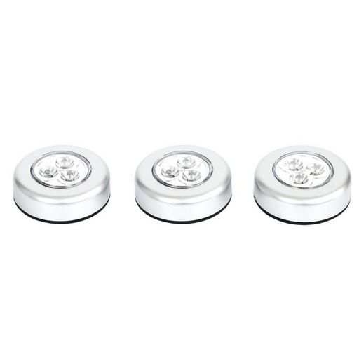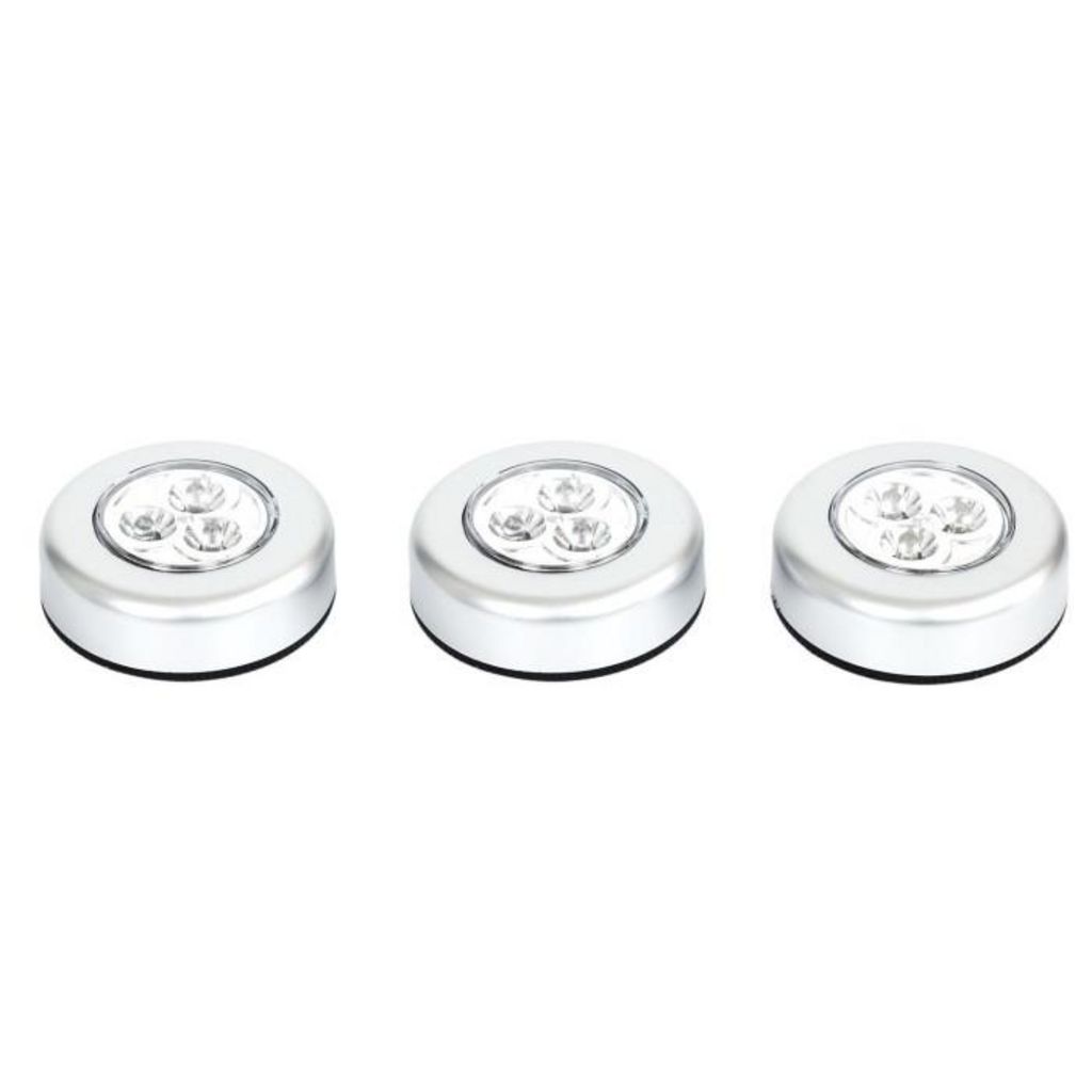Informations Techniques : Dimensions : L. 7 x l. 3 x H. 7 cm Matière : Polypropylène Spécificités : Pratique & Utile Lot de 3 Lampes à LED Forme Ronde Sans Raccordement 3 LEDs par Lampe Fonctionne par Pression (On/Off) Sans Clou ni Vis Adhésif Double Face ultra résistant inclus Fonctionne avec Piles